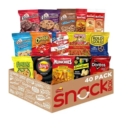 Each box is filled with an assortment of crave-worthy items that address any craving. The snack care package includes the following assortment:(4) 1 oz. Bags of lay?s bbq potato chips, (4) 1 oz. Bags of Doritos nacho cheese tortilla chips, (2) 1 oz. Bags of Cheetos crunchy, (2).75 oz bags of funyuns onion flavored rings, (2) 1 oz. Bags of rold gold tiny twists pretzels, (2) 1 oz. Bags of Chester's flaming hot fries, (2) 1.75 oz. Bags of munchies cheese fix snack mix, (2) 1.375 oz. Bags of munchies honey roasted peanuts, (3) 1.42 oz. Packs of munchies peanut butter on cheese crackers, (3) 1.42 oz. Packs of munchies peanut butter on toast crackers, (2) 2.12 oz. Packs of grandma?s mini sandwich vanilla cremes, (2) 2.5 oz. Packs of grandma?s home-style oatmeal raisin cookies, (2) 2.5 oz. Packs of grandma?s home-style chocolate brownie cookies, (2) 2 oz. Packs of grandma?s mini chocolate chip cookies, (2) 1.25 oz packs of cracker jacks original, (2).625 oz. Packs of smart food white cheddar popcorn, (2) 1 oz. Sticks of matador jerky.