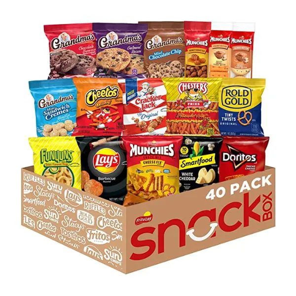 Each box is filled with an assortment of crave-worthy items that address any craving. The snack care package includes the following assortment:(4) 1 oz. Bags of lay?s bbq potato chips, (4) 1 oz. Bags of Doritos nacho cheese tortilla chips, (2) 1 oz. Bags of Cheetos crunchy, (2).75 oz bags of funyuns onion flavored rings, (2) 1 oz. Bags of rold gold tiny twists pretzels, (2) 1 oz. Bags of Chester’s flaming hot fries, (2) 1.75 oz. Bags of munchies cheese fix snack mix, (2) 1.375 oz. Bags of munchies honey roasted peanuts, (3) 1.42 oz. Packs of munchies peanut butter on cheese crackers, (3) 1.42 oz. Packs of munchies peanut butter on toast crackers, (2) 2.12 oz. Packs of grandma?s mini sandwich vanilla cremes, (2) 2.5 oz. Packs of grandma?s home-style oatmeal raisin cookies, (2) 2.5 oz. Packs of grandma?s home-style chocolate brownie cookies, (2) 2 oz. Packs of grandma?s mini chocolate chip cookies, (2) 1.25 oz packs of cracker jacks original, (2).625 oz. Packs of smart food white cheddar popcorn, (2) 1 oz. Sticks of matador jerky.