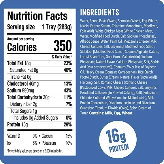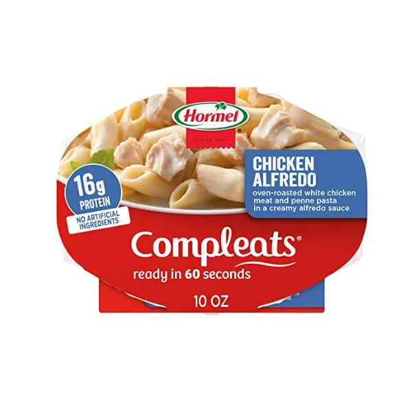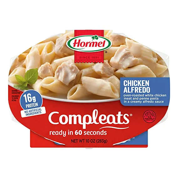 Made with high quality ingredients and homestyle recipes HORMEL COMPLEATS Chicken Alfredo has roasted white meat chicken and penne pasta in creamy Alfredo sauce – it?s big on flavor and a big value