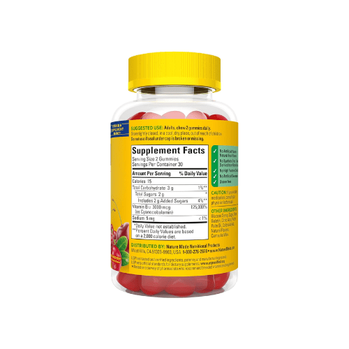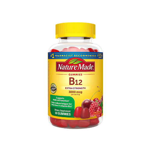 Nature Made Extra Strength Vitamin B12 Gummies with 3000 mcg B12 per serving are an enjoyable way to add B12 to your daily routine. Vitamin B 12 supports energy metabolism(1), supports brain cell function, and helps reduce fatigue for those low in B12. These gluten free Vitamin B12 gummies for adults have no artificial flavors, no synthetic dyes – colors derived from natural sources, no high fructose corn syrup, and no artificial sweeteners. B12 vitamins are important for vegetarians and vegans who may not consume enough Vitamin B12 foods in their diet. These Vitamin B12 gummies come in delicious cherry and mixed berry flavors with other natural flavors. Adults chew two Vit B12 gummies daily. Start your day with Nature Made B12 dietary supplements. USP has tested and verified ingredients, potency and manufacturing process. USP sets official standards for dietary supplements. Visit the USP verified website for more information. (1)Helps convert food into cellular energy. *Based on a 2022 survey of pharmacists who recommend branded vitamins and supplements. These statements have not been evaluated by the Food and Drug Administration. This product is not intended to diagnose, treat, cure, or prevent any disease.
