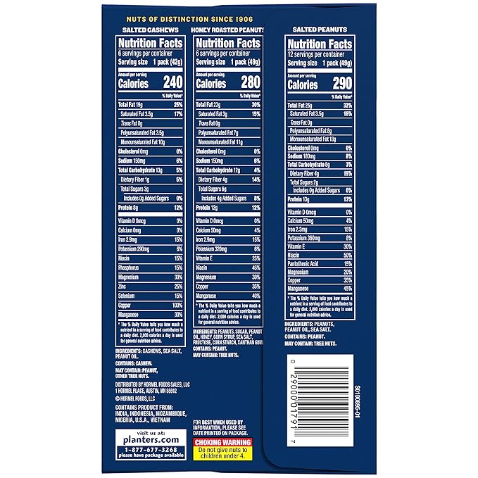 Home Grocery PLANTERS Variety Pack, Salted Cashews, Salted Peanuts & Honey Roasted Peanuts, On-the-Go Nut Snacks, Individually Packed Snacks, Mixed Nuts, Kosher, (36 Count)